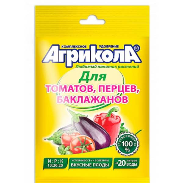 Подкормка удобрением Агрикола!3. Для приготовления рабочего раствора 25 г удобрения растворите в 10 л воды и обработайте 10—25 кв.м посевов в зависимости от способа обработки (полив или опрыскивание). В течение вегетации проводятся 4—5 внекорневых подкормок растений.Томат, баклажан: 1-ая внекорневая подкормка проводится через 10—15 суток после высадки рассады. Последующие с интервалом в 15 дней. Перец: 1ая внекорневая подкормка проводится через неделю после высадки рассады. Последующие — при образовании завязи.